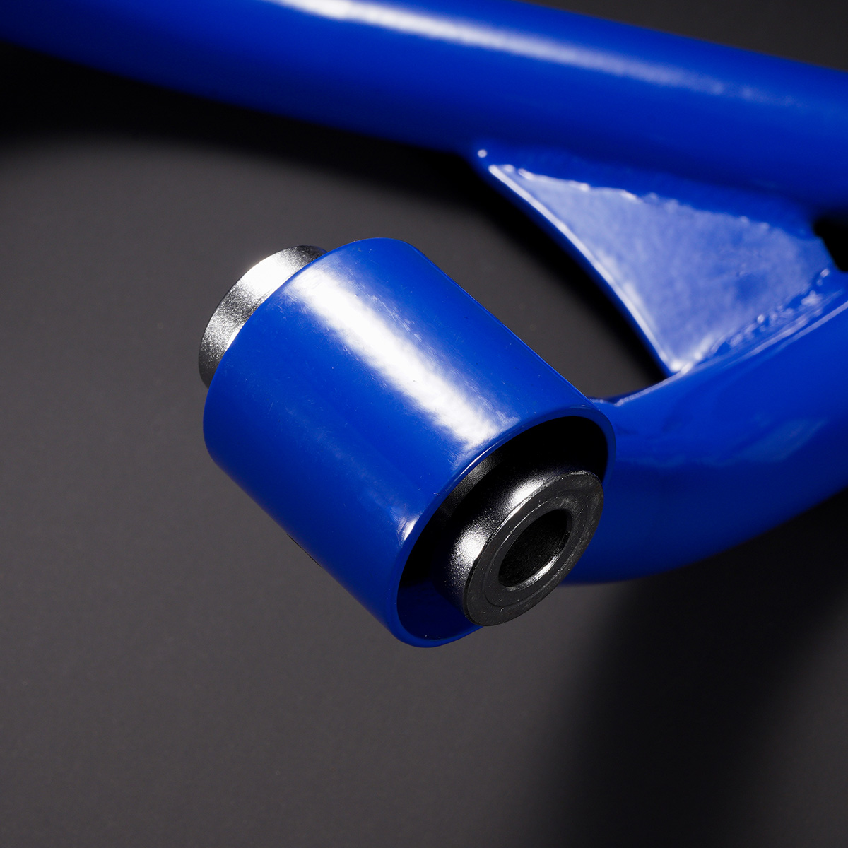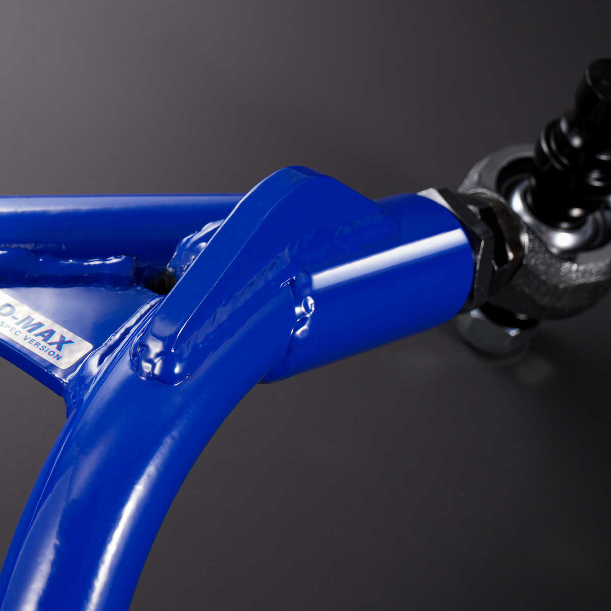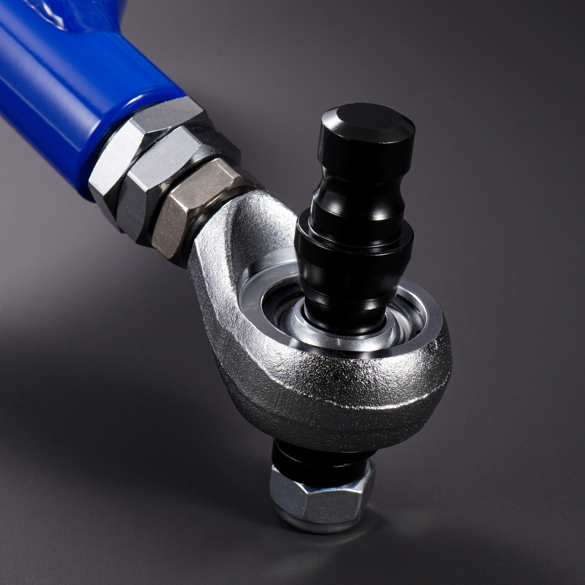 By installing this product, the upper arm side also allows for a wider range of camber adjustment, allowing for a wider range of suspension settings than ever before, and the increased contact area of the rear tire significantly improves grip performance. By simply replacing it with this product, the bush is replaced with a pillow ball, eliminating twisting and reducing alignment changes, improving unstable behavior, increasing the rigidity of the arm, and eliminating any concerns. Furthermore, by repeatedly remaking samples with a 3D printer, the structure has been improved to avoid the reinforcement bar from the frame, and the design makes it less likely to hit the frame even when the vehicle height is lowered, allowing for freer settings that were not possible before.