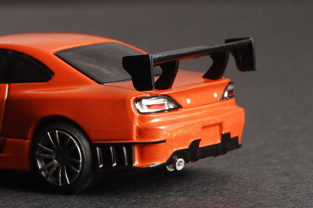 The Mini GT series is a 1/64 scale model lined up by Hong Kong's TSM MODEL. This model car is a perfect reproduction of the Nissan S15 Silvia with the D-MAX body kit, bonnet, fenders, and other parts.