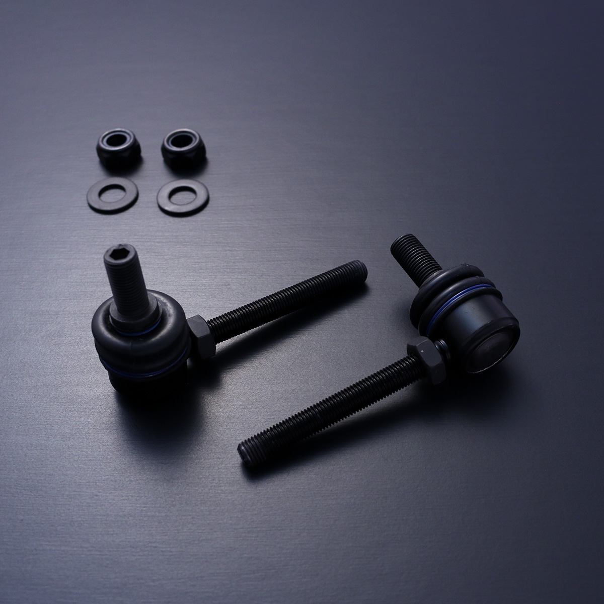 調整式スタビライザーリンク(通称スタビリンク)とは、スタビライザーとサスペンションを繋ぐロッドの事をいいます。純正値の車高では、どの車種でもスタビライザーとスタビリンクの角度はほぼ直角になっていますが、車高を下げた場合には、この角度が変わってしまい、スタビライザー本来の性能が発揮しなくなり左右のストロークが変わり、ロール制御機能が低下し、乗り心地も悪くなってしまいます。車高を下げた場合は、調整式スタビライザーを装着する事で、純正値の角度に調整する事ができますので、本来の性能を発揮する事ができます。