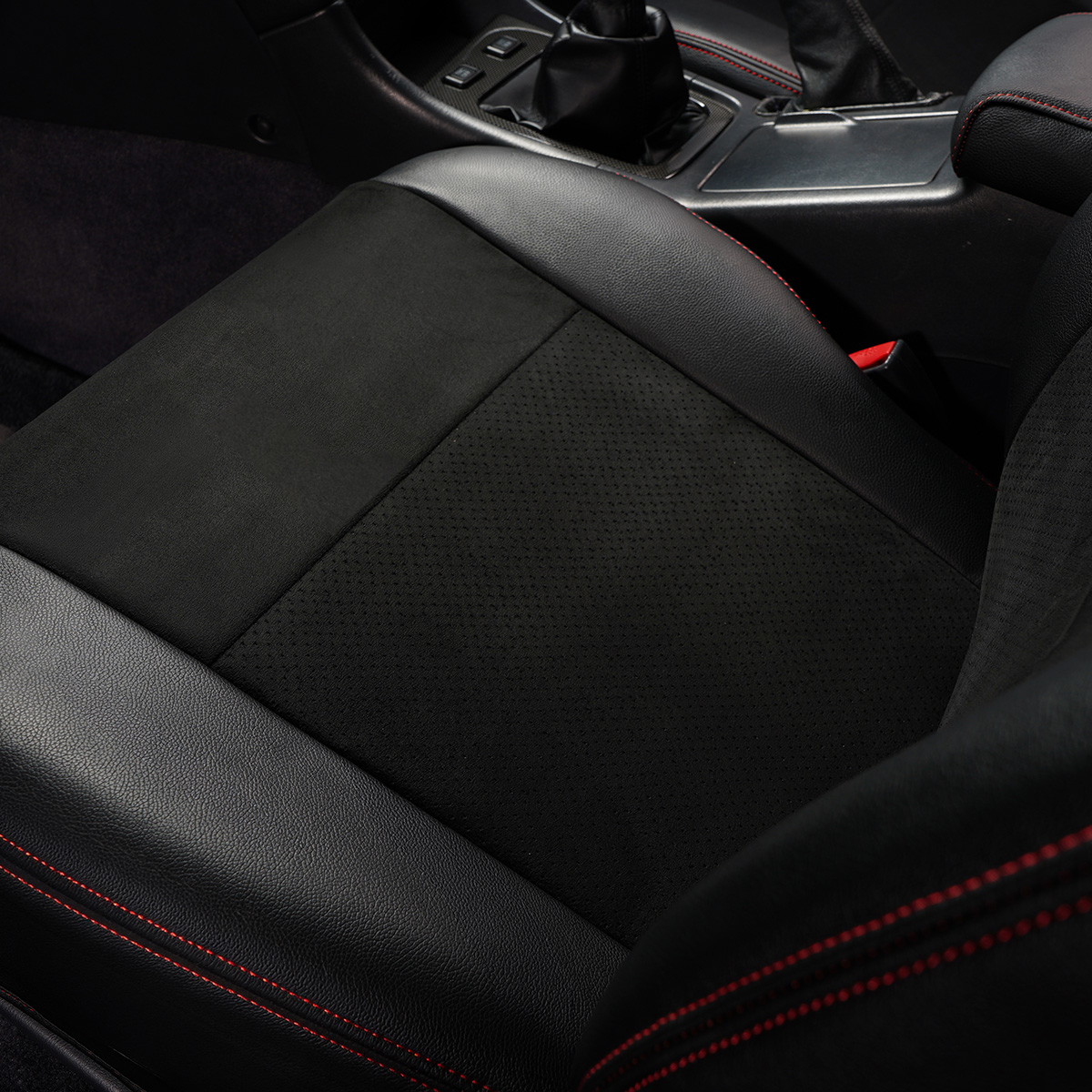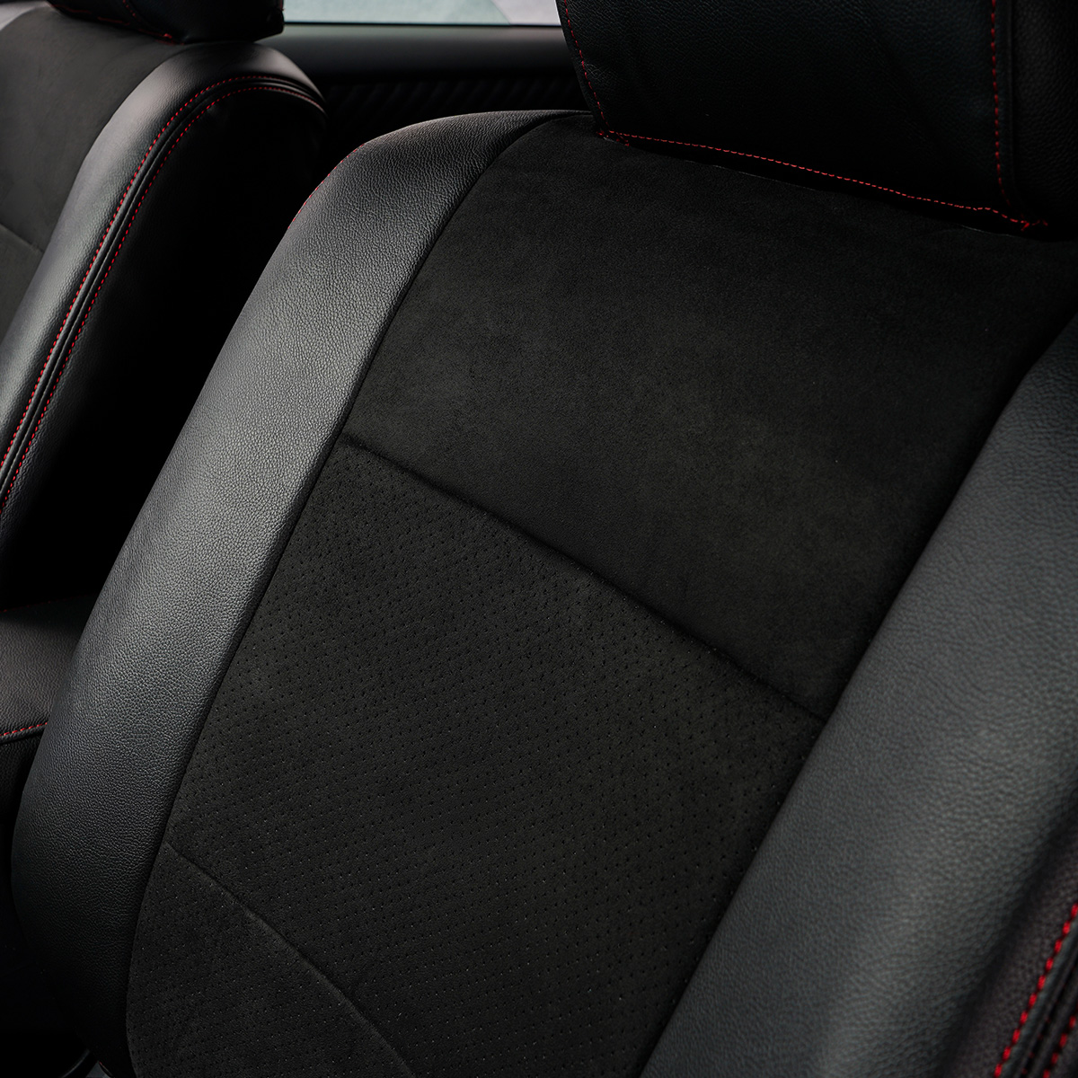 上位モデルのシートをイメージさせる、スエード調生地をシート中央部に採用し、通気性を考えパンチング加工を施しました。